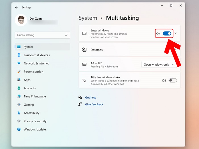Trong phần Snap windows, bật tùy chọn đầu tiên (nếu chưa bật). Bạn cũng có thể bật thêm các tùy chọn phụ như: