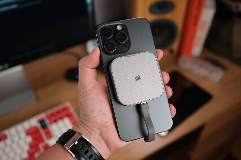 Corsair EX300U nổi bật với thiết kế vuông vắn, tối giản, kích thước chỉ 64mm x 64mm x 10mm và trọng lượng nhẹ nhàng 38g – dễ dàng bỏ túi hoặc gắn trực tiếp lên thiết bị. Điểm nhấn là vòng MagSafe tương thích ở mặt sau, cho phép gắn từ tính lên iPhone 15/16 series (qua case MagSafe), một số smartphone Android hỗ trợ nam châm, hoặc bất kỳ bề mặt kim loại nào như laptop kim loại.