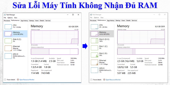 RAM bị lỗi hoặc hỏng: Một thanh RAM lỗi có thể kéo theo cả hệ thống không nhận đủ.