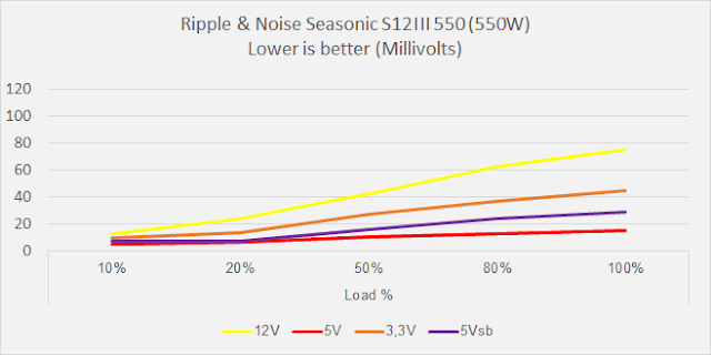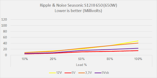 Ripple noise của S12 III chỉ dừng ở mức khá. Phiên bản S12 III 650 có mức ripple tốt nhất trong cả 3 phiên bản. Về tổng thể Ripple noise của S12 III thua thiệt hơn S12II kha khá nhưng vẫn nằm trong giới hạn an toàn của tiêu chuẩn ATX